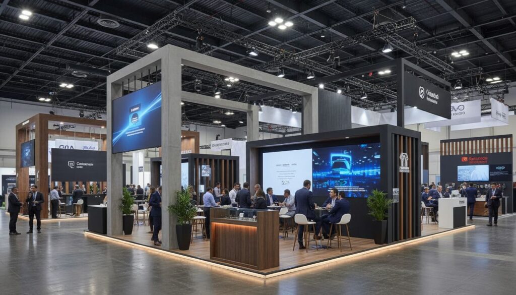 - Integración audiovisual desde el diseño. Un stand sin pantalla en 2026 es un stand incompleto. Asegúrate de que la integración de monitores, reproductores y conectividad esté contemplada desde el brief inicial, no añadida de último minuto con cables visibles.